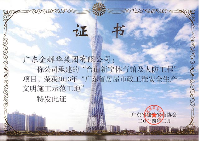 熱烈慶祝我公司“臺山市新寧體育館及人防工程”榮獲廣東省房屋市政工程安全生產(chǎn)文明施工示范工地。