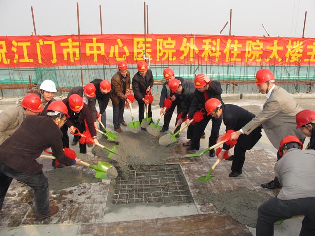 2014年1月6日上午11時(shí),江門中心醫(yī)院外科住院大樓工程舉行封頂儀式,江門市衛(wèi)生局宋華局長、江門中心醫(yī)院梁伯進(jìn)院長、我集團(tuán)公司領(lǐng)導(dǎo)張國球、李甫、盧文權(quán)、張國勝出席了封頂儀式。江門市衛(wèi)生局宋華局長在工程現(xiàn)場會議室首先聽取了江門中心醫(yī)院外科住院大樓功能介紹和施工單位廣東金輝華集團(tuán)有限公司對目前工程進(jìn)度的簡單匯報(bào),該工程地下2層,地上26層,建筑面積6.4萬平方米。隨后在江門中心醫(yī)院領(lǐng)導(dǎo)和施工單位負(fù)責(zé)