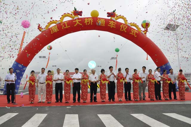 2011年6月22日上午,開(kāi)平市委、市政府舉辦隆重而簡(jiǎn)單的儀式,慶祝潭江大橋落成通車。市領(lǐng)導(dǎo)馮立堅(jiān)、黃耀雄、吳平超、薛衛(wèi)東、趙會(huì)強(qiáng)、張星杰、謝超武、陳偉成、梁和平,以及我集團(tuán)公司項(xiàng)目領(lǐng)導(dǎo)小組成員部門單位的領(lǐng)導(dǎo),參建項(xiàng)目的設(shè)計(jì)、監(jiān)理、施工、監(jiān)測(cè)等單位代表共50多人參加了儀式。潭江大橋經(jīng)重建后全長(zhǎng)328米,橋面寬度為31.5米,采取雙向6車道設(shè)計(jì)。全橋設(shè)計(jì)新穎,采用花崗巖欄桿,橋中主跨兩端設(shè)有四座景觀