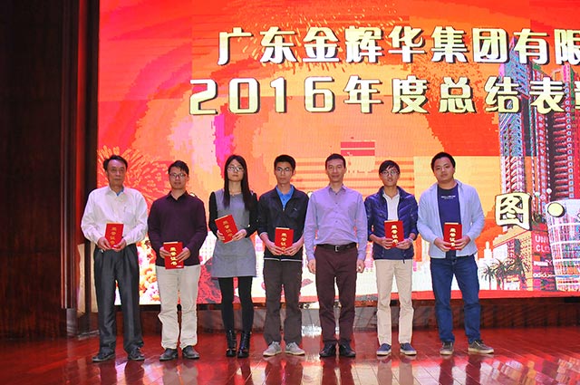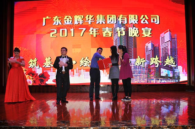 會(huì)議中董事局主席周珉興向所有員工發(fā)出了新春祝福!主席周珉興、董事長(zhǎng)李甫、副總裁張國(guó)球、副總裁兼總工程師盧文權(quán)、副總裁兼黨委書(shū)記張解矛和團(tuán)委書(shū)記譚翠瓊分別宣讀了表彰決定和優(yōu)秀名單,并分別主持了公司工程優(yōu)秀創(chuàng)優(yōu)項(xiàng)目部、“2016省級(jí)工法”先進(jìn)工作者、優(yōu)秀員工、優(yōu)秀黨員和優(yōu)秀團(tuán)員的表彰環(huán)節(jié),領(lǐng)導(dǎo)們?yōu)樗麄冾C發(fā)了榮譽(yù)證書(shū),對(duì)他們所作出的成績(jī)進(jìn)行了鼓勵(lì),其中:表彰公司工程優(yōu)秀創(chuàng)優(yōu)項(xiàng)目部3個(gè),“2016省級(jí)工法”先進(jìn)工作者3名,優(yōu)秀員工獎(jiǎng)28名,表彰優(yōu)秀黨員7名,優(yōu)秀團(tuán)員5名。最后由工會(huì)主席陳維民代表公司向受到表彰的各位同仁表示衷心的祝賀,向奮戰(zhàn)在各崗位的同事致以最真誠(chéng)的感謝!并勉勵(lì)獲獎(jiǎng)?wù)邆円湎s譽(yù)、戒驕戒躁,把獲得的榮譽(yù)作為新的起點(diǎn),在今后的工作中再做貢獻(xiàn)、勇創(chuàng)佳績(jī)!我們有理由堅(jiān)信有這樣一批優(yōu)秀的員工和團(tuán)隊(duì),在他們共同努力下,2017年將又是一個(gè)收獲的吉祥年??偨Y(jié)大會(huì)后,上演了一場(chǎng)歡天喜地的迎春晚會(huì),晚會(huì)中,江門(mén)市建筑協(xié)會(huì)會(huì)長(zhǎng)李耀南上臺(tái)作了重要講話(huà),并充分肯定金輝華集團(tuán)有限公司的成績(jī),勉勵(lì)金輝華集團(tuán)有限公司為重振開(kāi)平建筑業(yè)雄風(fēng)實(shí)現(xiàn)跨越發(fā)展再立新功。