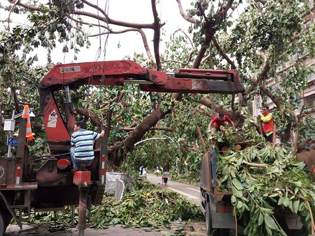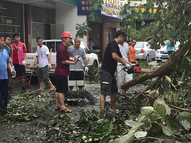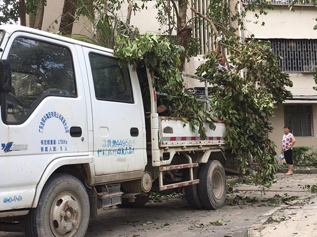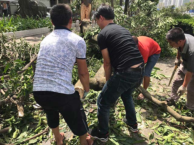 2017年8月23日中午12點50分,第13號臺風(fēng)“天鴿”正面襲擊珠海市,大批樹木被攔腰折斷或連根拔起,造成大部分主干道堵塞,嚴(yán)重影響當(dāng)?shù)鼐用窆ぷ骱蜕??!疤鞛?zāi)無情人有情”,我集團(tuán)珠海公司在獲悉災(zāi)情后,迅速行動,組織人員和車輛,全力以赴針對突出的受阻道路進(jìn)行清理工作。在安平路、桃園路、海虹路、東風(fēng)路等路段,隨處可見殘樹斷枝錯亂橫陳,珠海公司員工與當(dāng)?shù)鼐用褚黄鹎鍜呃?,搬移樹木。直到該路段清障工作完成,道路交通基本恢?fù)。