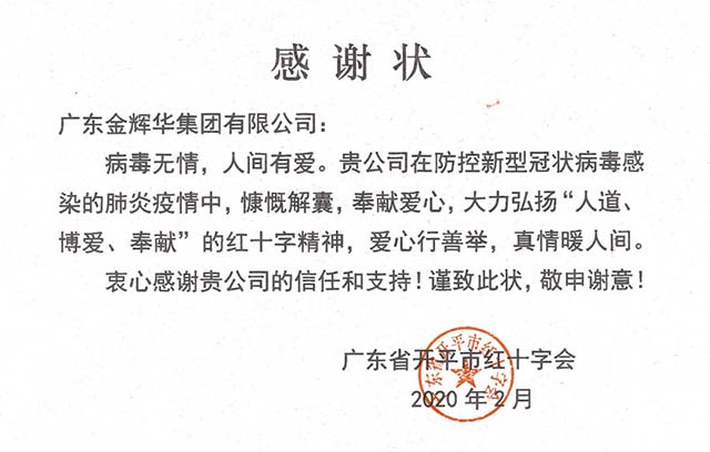 今年春節(jié),一場突如其來的新型冠狀病毒感染的肺炎疫情牽動著每一個人的心,更牽動著每一位金輝華人。新型冠狀病毒感染的肺炎疫情(簡稱“疫情”)發(fā)生后,在習近平總書記:生命重于泰山,疫情就是命令,防控就是責任的指引下,并在開平市新冠肺炎疫情防控指揮部的統(tǒng)一部署下,開平市紅十字會,慈善會共同發(fā)布了《開平市紅十字會、開平市慈善會關于募集我市疫情防控工作資金和物資的倡議書》。廣東金輝華集團有限公司積極響應、踴躍捐贈,體現(xiàn)了本公司“一方有難、八方支援、同舟共濟”的優(yōu)良傳統(tǒng)。2020年2月3日,公司定向捐贈長沙街道辦事處10萬元,開平市20萬元,合計30萬元用于新冠肺炎疫情防控。用自己的方式,傳遞著建筑人的溫度、溫情和專業(yè)力量,展現(xiàn)民營企業(yè)的責任擔當,全力做好疫情防控工作,為開平的疫情防控全局作出了積極貢獻。