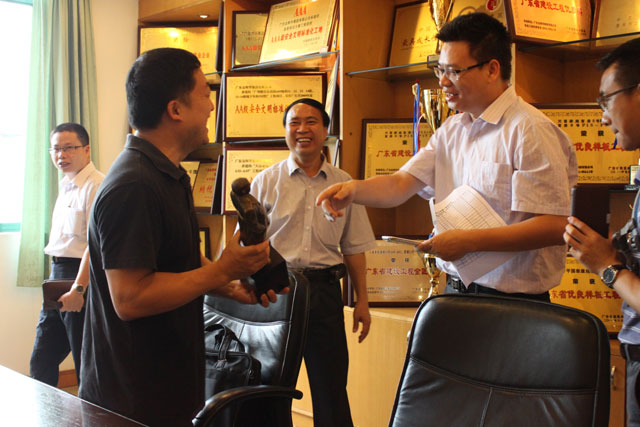 圖為江門市國稅局黨委辦公室主任錢明雄對(duì)我司的企業(yè)文化表示贊同,留影紀(jì)念